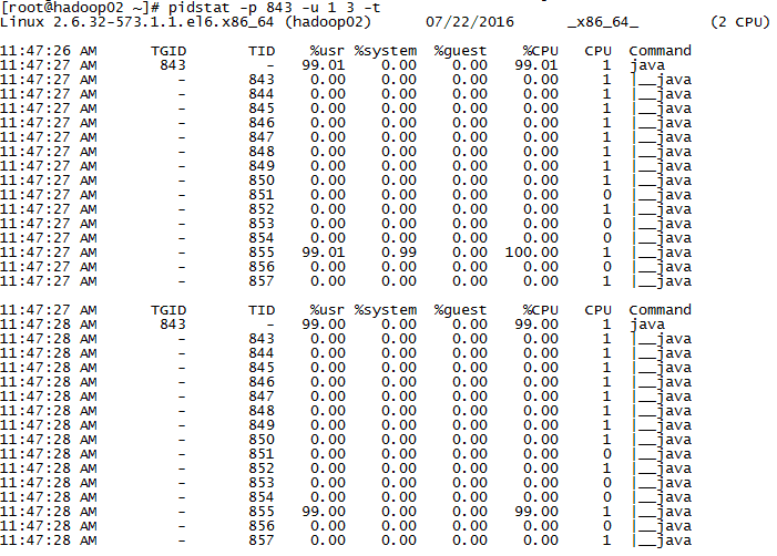 注:其实中TID就是线程ID,%usr表示用户线程使用率,从图中可以看到855这个线程占用cpu非常的高。