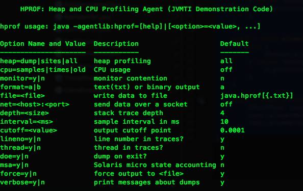 hprof不是独立的监控工具,它只是一个java agent工具,它可以用在监控Java应用程序在运行时的CPU信息和堆内容,使用java -agentlib:hprof=help命令可以查看hprof的使用文档。