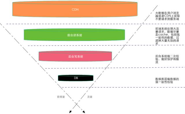 对大流量系统的数据做分层校验也是最重要的设计原则,所谓分层校验就是对大量的请求做成“漏斗”式设计,如图3所示:在不同层次尽可能把无效的请求过滤,“漏斗”的最末端才是有效的请求,要达到这个效果必须对数据做分层的校验,下面是一些原则: