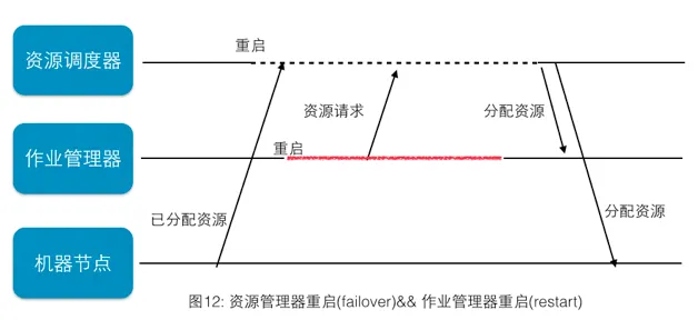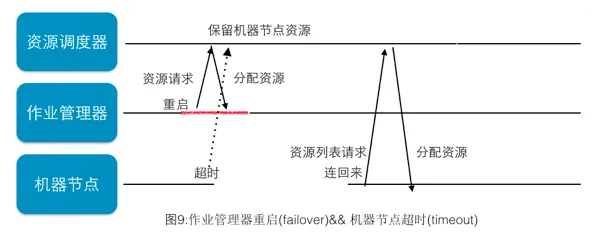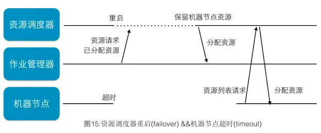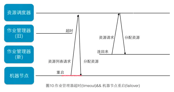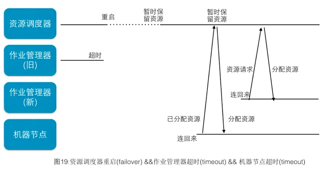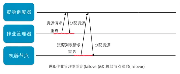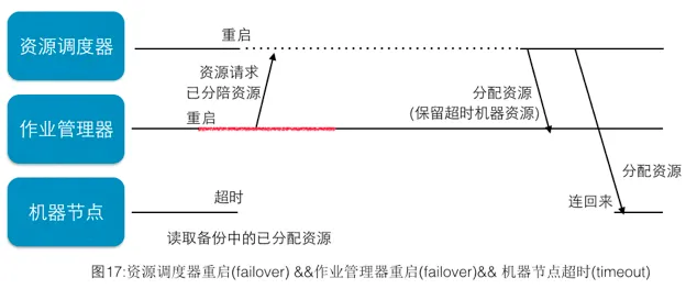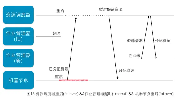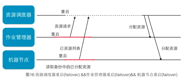 针对离线作业:如果有的tubo没有连上来,那么所有AM在这台机器上的资源FuxiMaster都会认为不可用, AM会收到资源回收的消息; 如果有的AM没有连上来,那么这个AM所有的资源FuxiMaster都会认为不存在(因为没有request),到下次AM连上来时,会收到所有资源被回收的消息
