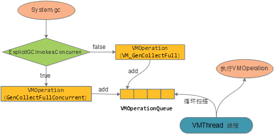 1:system.gc的仅仅是封装成一个VMOperation,添加到VMOperationQueue。VMThread会循环扫描Queue, 执行VMOperation。