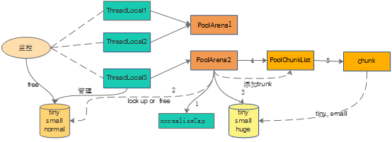 1:为了提升性能,在ThreadLocal里对tiny,small,normal进行缓存。