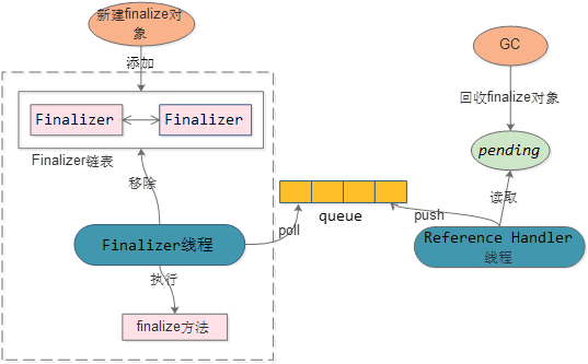对象被GC时,如果是Finalizer对象,会将对象赋值到pending对象。Reference Handler线程会将pending对象push到queue中。
