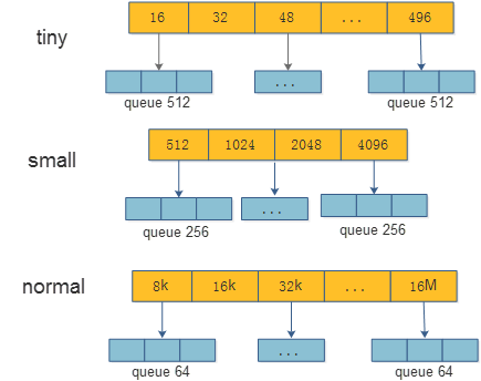 内存分为tiny(16,512)、small[512,8K)、normal[8K,16M]、huge[16M,)这四种类型。其中tiny和small在一个page里面分配。Normal是多个page组成。Huge是单独分配。