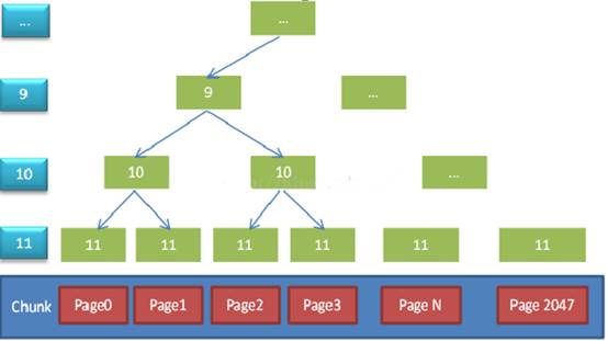 Page默认大小为8k,由2k个page组合成一个chunk。一个chunk的大小为16M。数据结构为一颗二叉树,如果一个节点存在一个已经被分配的子节点,则该节点不能被分配。每次内存分配都是8K*(2^n),如果需要24K内存时,实际上会申请到一块32K的内存。