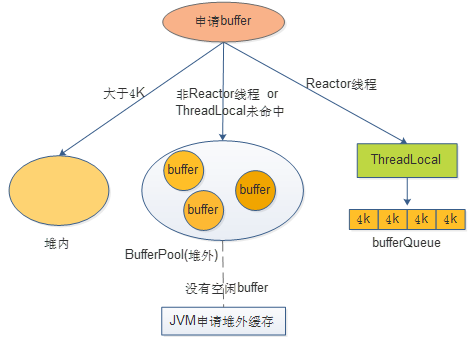 3:如果size>16M,则申请unpool的buffer。否则从ThreadLocal里面获取对应的buffer。