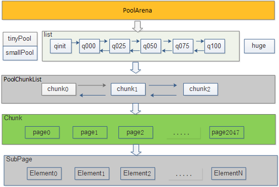 PoolChunk :主要负责内存块的分配和回收。默认内存块大小为8k*2K=16M。该大小为从内存中申请的连续空间。