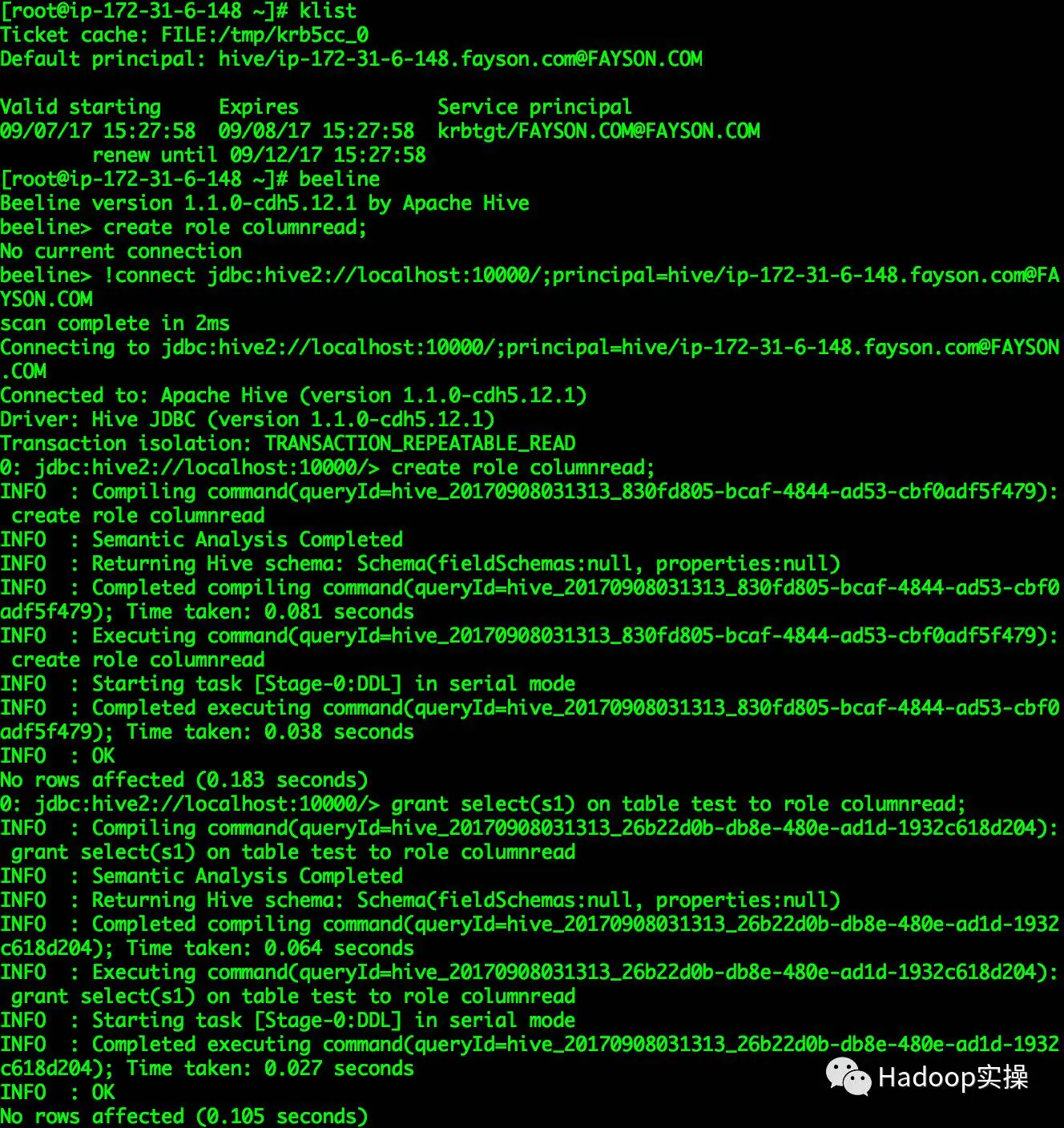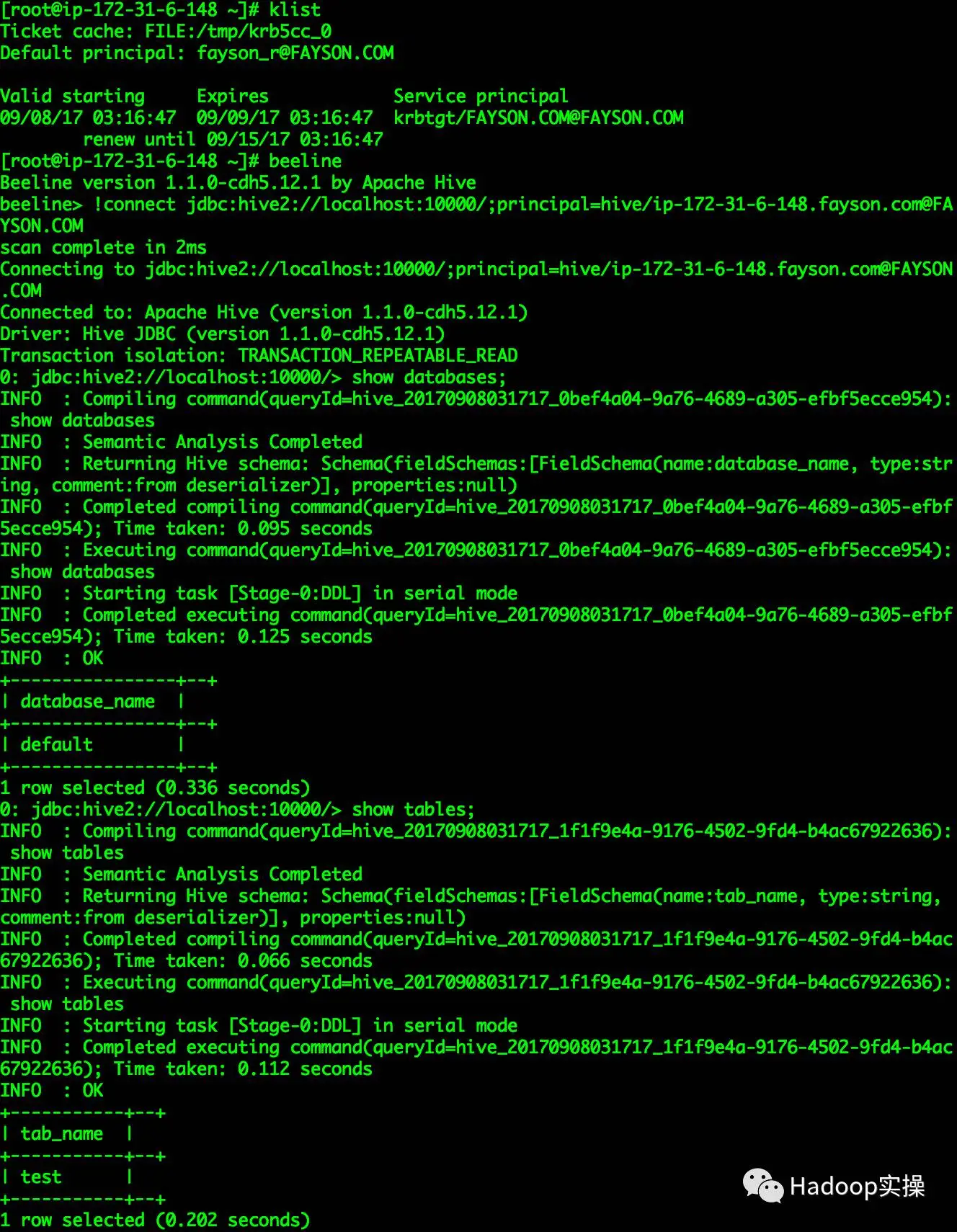 beeline> !connect jdbc:hive2://localhost:10000/;principal=hive/ip-172-31-6-148.fayson.com@FAYSON.COM