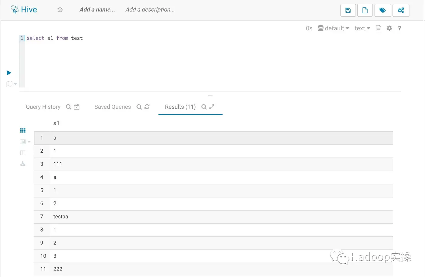 0: jdbc:hive2://localhost:10000/> select s1 from test;