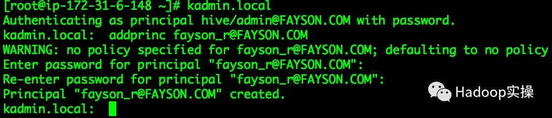 kadmin.local: addprinc fayson_r@FAYSON.COM