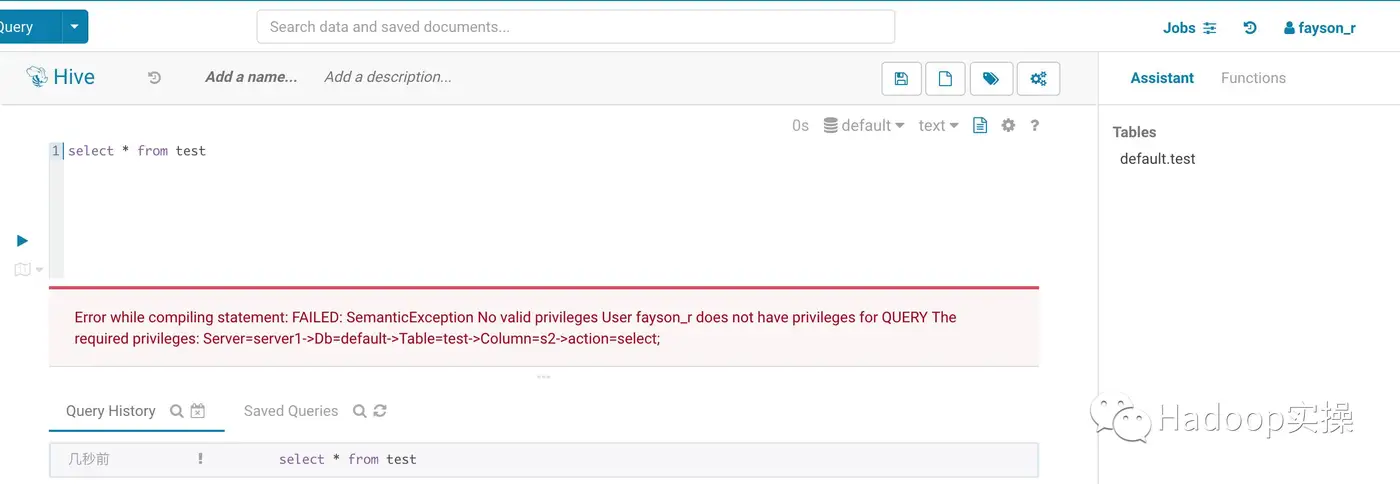 fayson_r用户所属用户组为fayson_r,该组只拥有对test表s1列的读权限,因此在select和count的时候只能对s1列进行select和count,fayson_r用户无权限浏览/user/hive/warehouse下的所有目录;使用hue只能对test表s1列进行select和count操作,无权限浏览/user/hive/warehouse目录及目录下所有子目录。