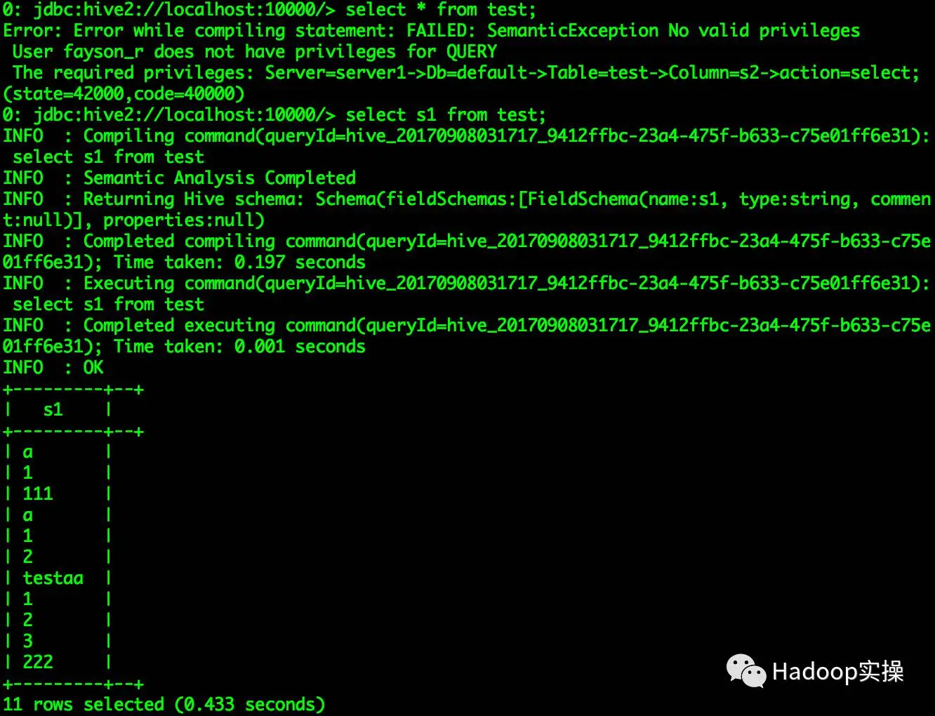 The required privileges: Server=server1->Db=default->Table=test->Column=s2->action=select; (state=42000,code=40000)