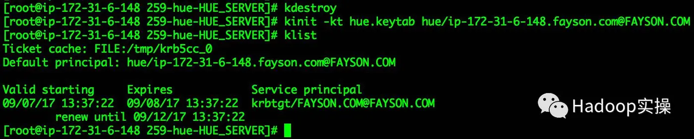 [root@ip-172-31-6-148 259-hue-HUE_SERVER]# kinit -kt hue.keytab hue/ip-172-31-6-148.fayson.com@FAYSON.COM