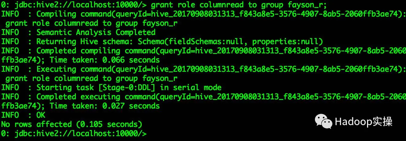 0: jdbc:hive2://localhost:10000/> grant role columnread to group fayson_r;