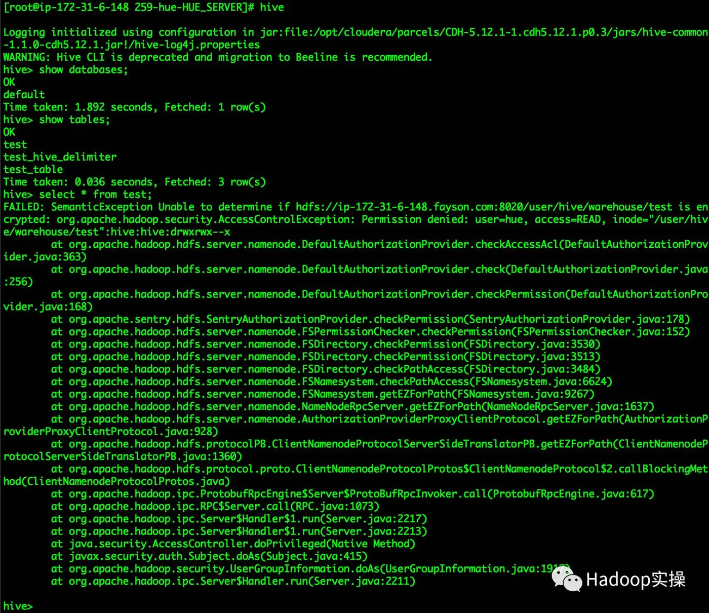 通过Hive配置(hadoop.proxyuser.hive.groups)可以限制用户组使用HiveCLI访问Hive,未配置在内的用户组是不可以通过Hive CLI访问(如fayson用户)。在测试中发现impala和hive用户可以通过Hive CLI访问hive表并未受权限控制,而hue用户只能show databases和show tables不能select表。报HDFS访问权限异常,由于hive表的属主均为hive,hive和impala用户都属于hive组,hue用户不属于hive组导致。