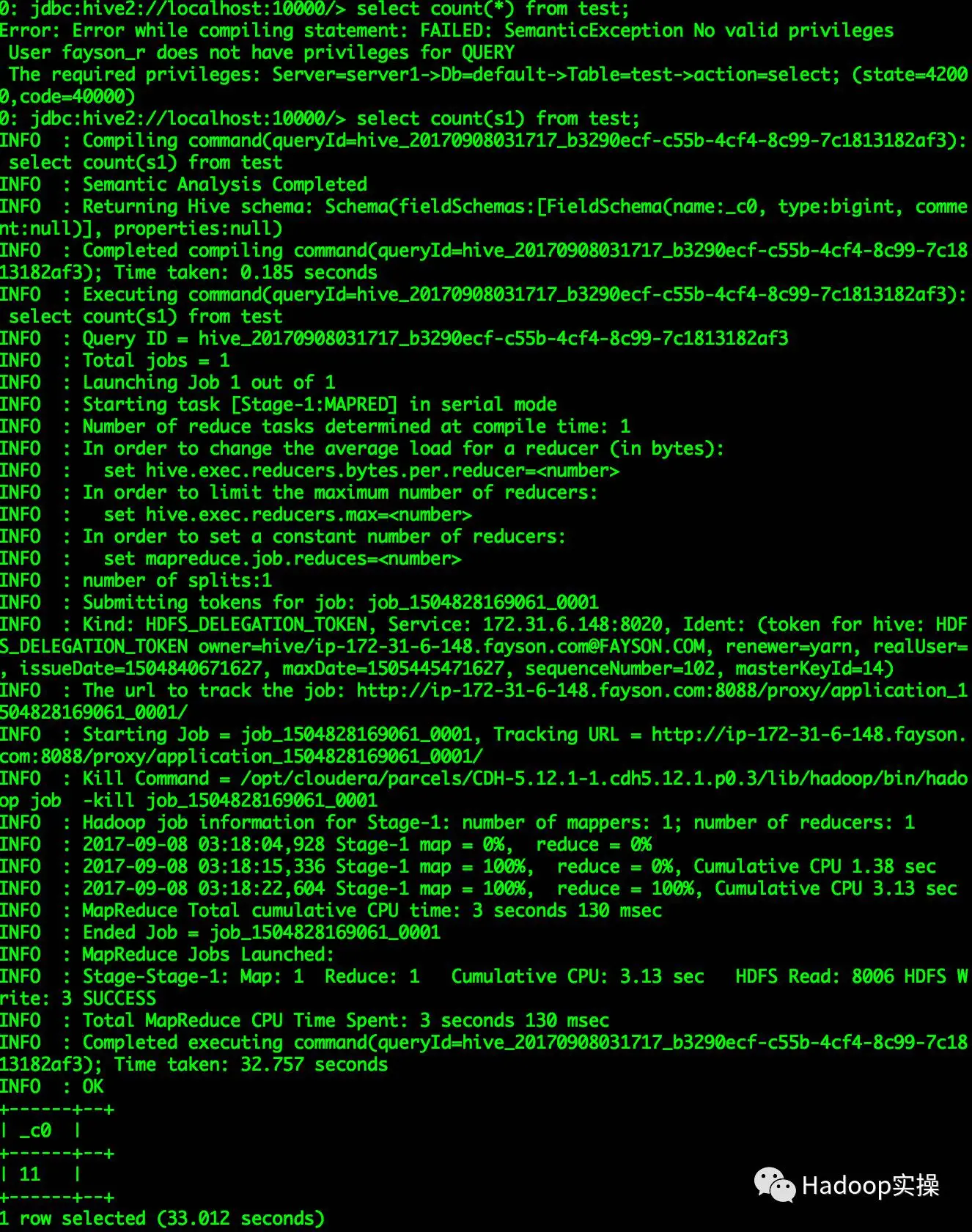 - 使用fayson用户测试,此用户被禁止使用HiveCLI