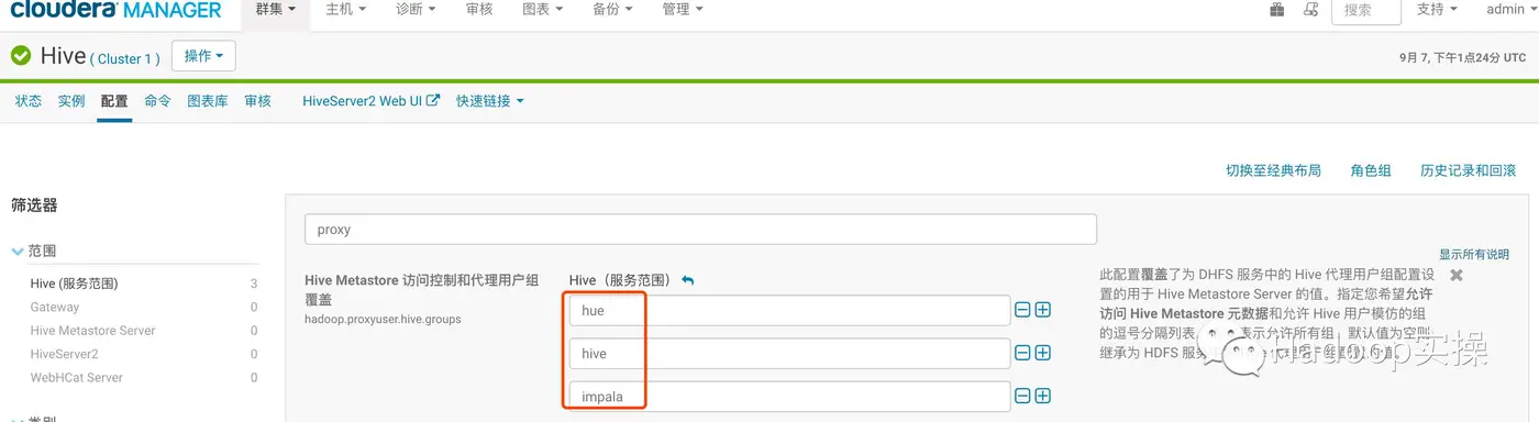 进入Hive服务,修改hadoop.proxyuser.hive.group配置,此配置会覆盖HDFS服务中hive代理用户组配置,默认值为空则继承HDFS服务中的hive代理用户配置