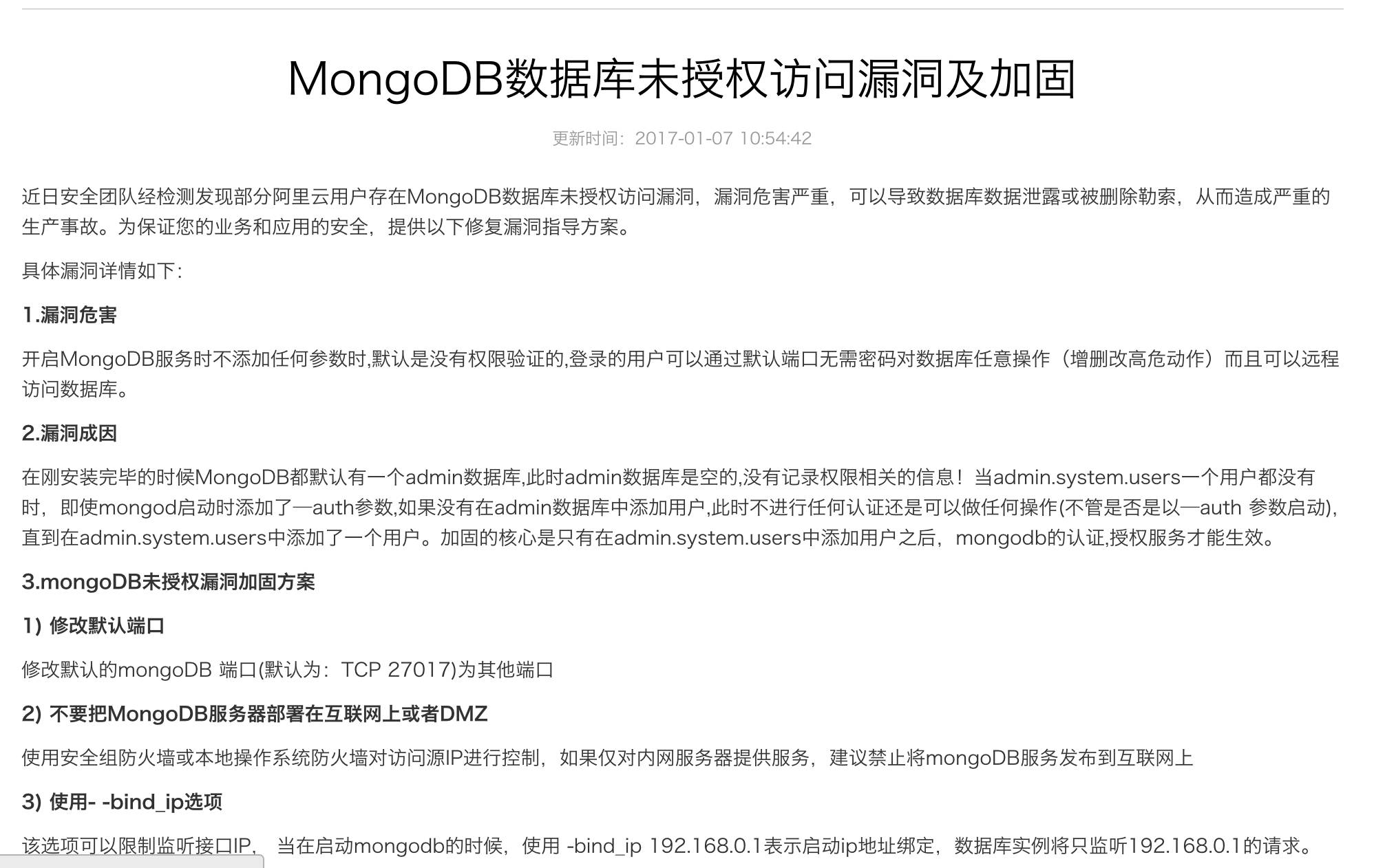 阿里云官方网站第一时间发布公告《MongoDB数据库未授权访问漏洞及加固》给出相应修复建议。同时,立即通过邮件、站内信和短信进一步提醒。