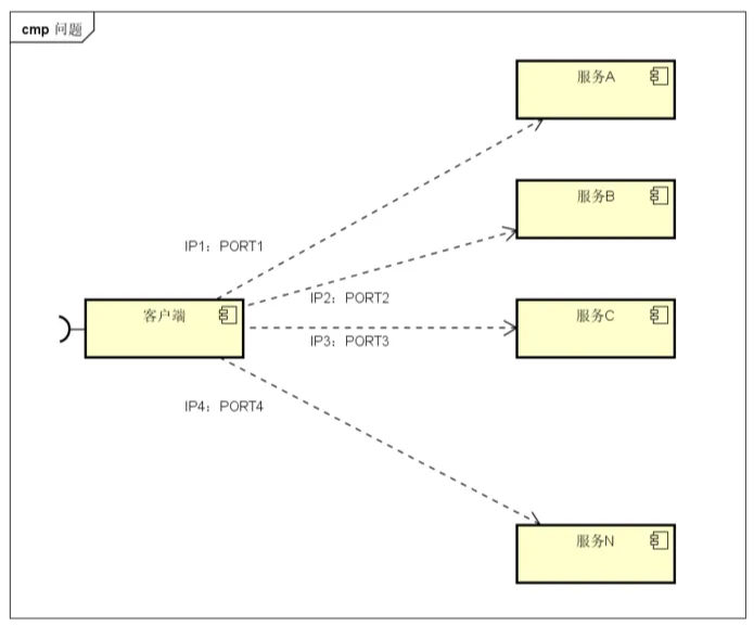 图中,客户端的一个接口,需要调用服务A-N。客户端必须要知道所有服务的网络位置的,以往的做法是配置是配置文件中,或者有些配置在数据库中。这里就带出几个问题: