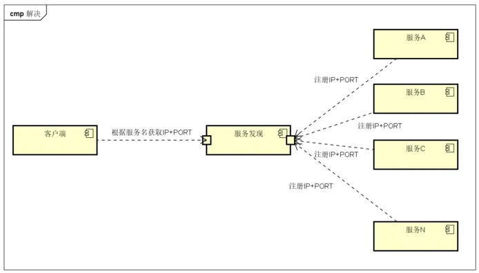 与之前一张不同的是,加了个服务发现模块。图比较简单,这边文字描述下。服务A-N把当前自己的网络位置注册到服务发现模块(这里注册的意思就是告诉),服务发现就以K-V的方式记录下,K一般是服务名,V就是IP:PORT。服务发现模块定时的轮询查看这些服务能不能访问的了(这就是健康检查)。客户端在调用服务A-N的时候,就跑去服务发现模块问下它们的网络位置,然后再调用它们的服务。这样的方式是不是就可以解决上面的问题了呢?客户端完全不需要记录这些服务网络位置,客户端和服务端完全解耦!