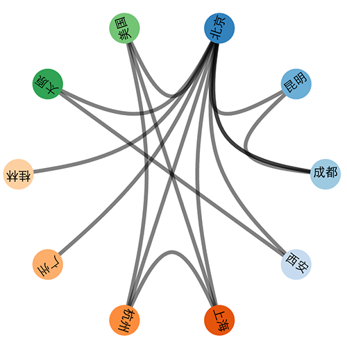图中我们能看到每时每刻有多少飞行在我们头上飞,有北京-杭州、杭州-日本、上海-北京的航班等等,如果你想知道哪个机场最繁忙,那就可以用到捆图来展现了;