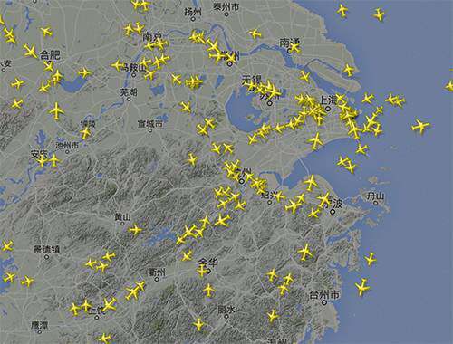 下图是航班查询网站全球航班雷达(FlightRadar24)显示的今日长三角地区的飞机飞行图: