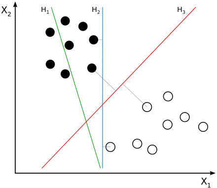 H1 不能把类别分开。H2 可以,但只有很小的间隔。H3 以最大间隔将它们分开。![]()