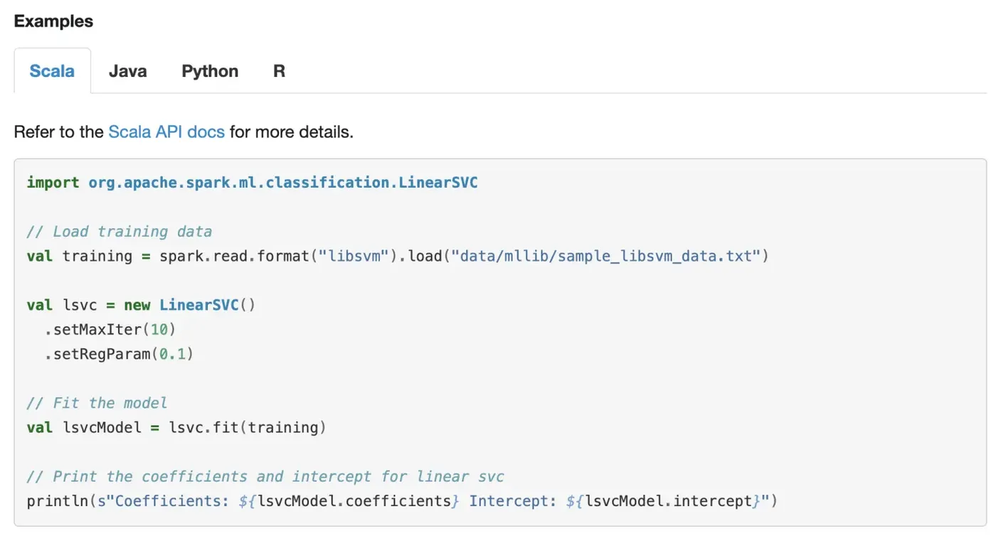 Spark ML中的LinearSVC支持使用线性SVM进行二进制分类。 在内部,它使用OWLQN优化器优化铰链损耗