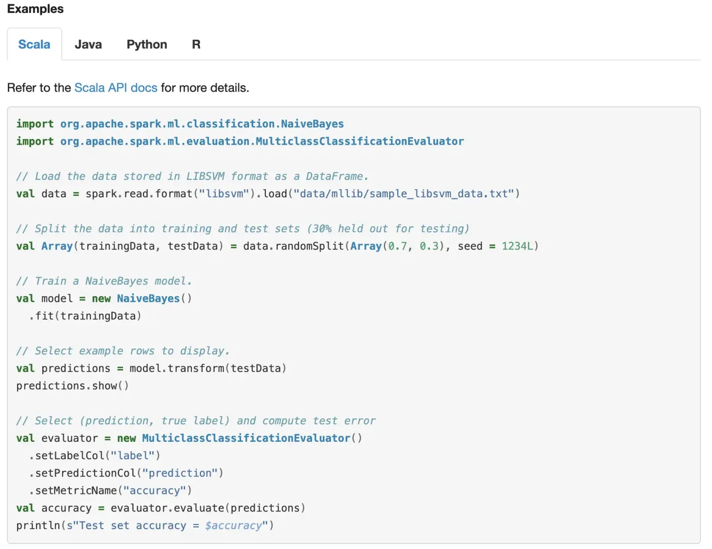 输入数据:这些模型通常用于文档分类。在该上下文中,每个观察是一个文档,每个特征代表一个术语。特征值是术语的频率(在多项式朴素贝叶斯中)或零或一个,表示该术语是否在文档中找到(在伯努利朴素贝叶斯中)。要素值必须为非负值。使用可选参数“multinomial”或“bernoulli”选择模型类型,默认为“multinomial”。对于文档分类,输入特征向量通常应该是稀疏向量。由于训练数据仅使用一次,因此不必对其进行缓存。
