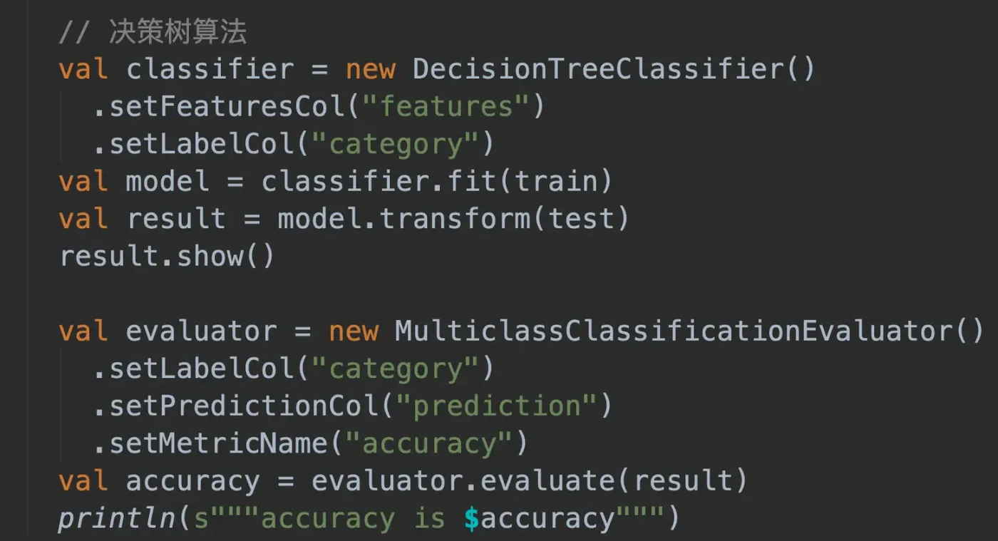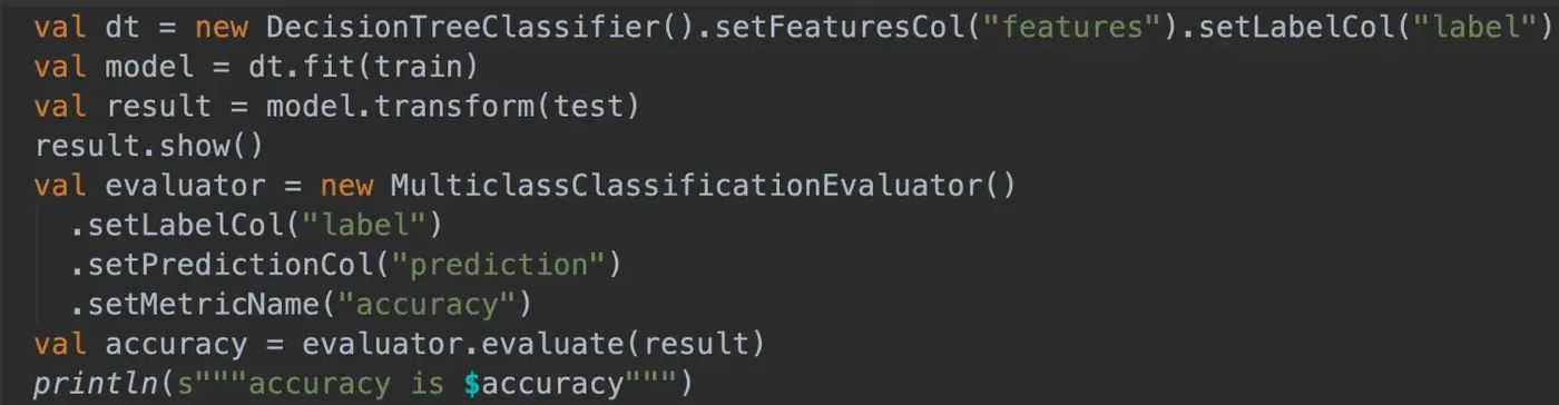 以下示例以LibSVM格式加载数据集,将其拆分为训练和测试集,在第一个数据集上训练,然后评估保持测试集。我们使用两个特征变换器来准备数据;这些帮助标记和分类特征的索引类别,向决策树算法可识别的DataFrame添加元数据。