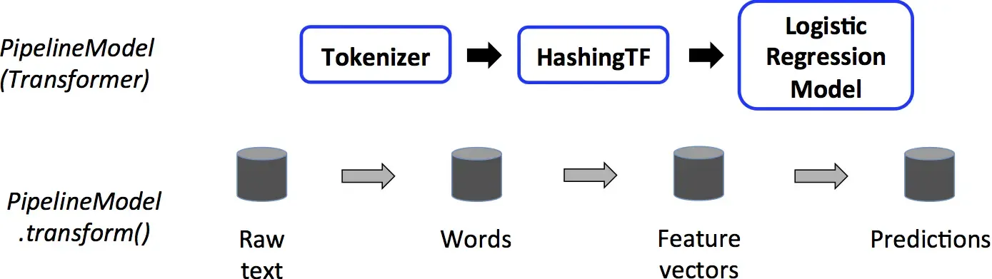 在上图中,PipelineModel具有与原始Pipeline相同的阶段数,但原始Pipeline中的所有Estimators都变为Transformers。 当在测试数据集上调用PipelineModel的transform()方法时,数据将按顺序通过拟合的管道传递。 每个阶段的transform()方法都会更新数据集并将其传递给下一个阶段。