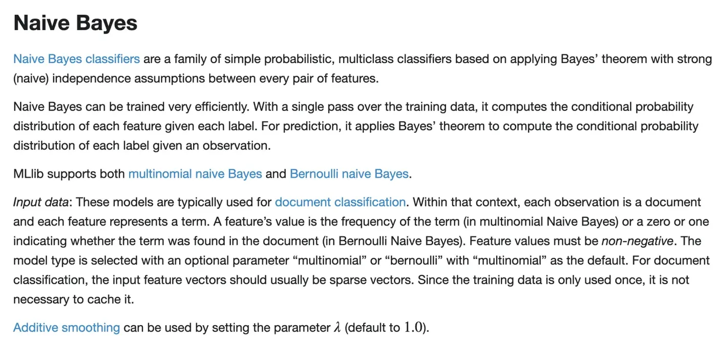 MLlib支持多项式朴素贝叶斯和伯努利朴素贝叶斯。