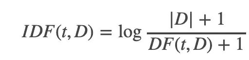 其中| D |是语料库中的文档总数。由于使用了对数,如果一个术语出现在所有文档中,其IDF值将变为0.