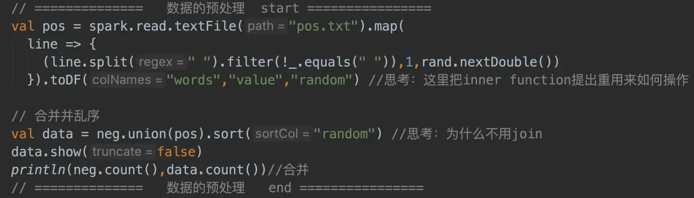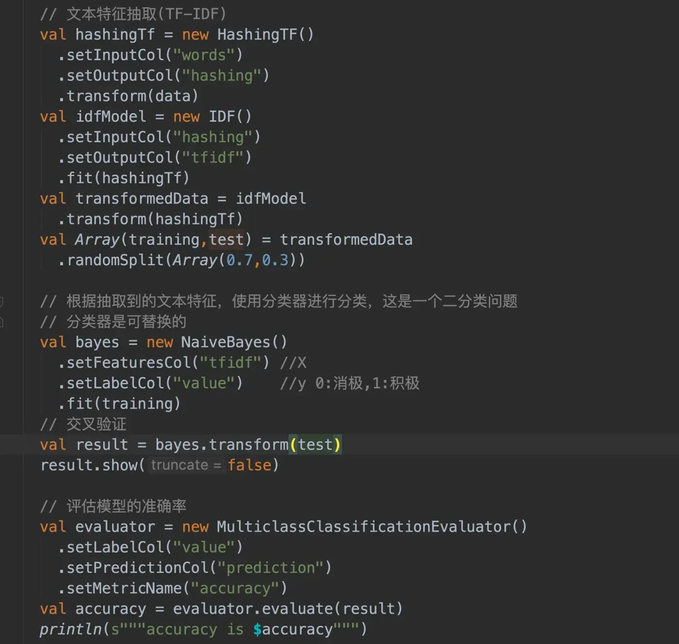 在下面的代码段中,我们从一组句子开始。我们使用Tokenizer将每个句子分成单词。对于每个句子(单词包),我们使用HashingTF将句子散列为特征向量。我们使用IDF重新缩放特征向量;这通常会在使用文本作为功能时提高性能。然后我们的特征向量可以传递给学习算法。