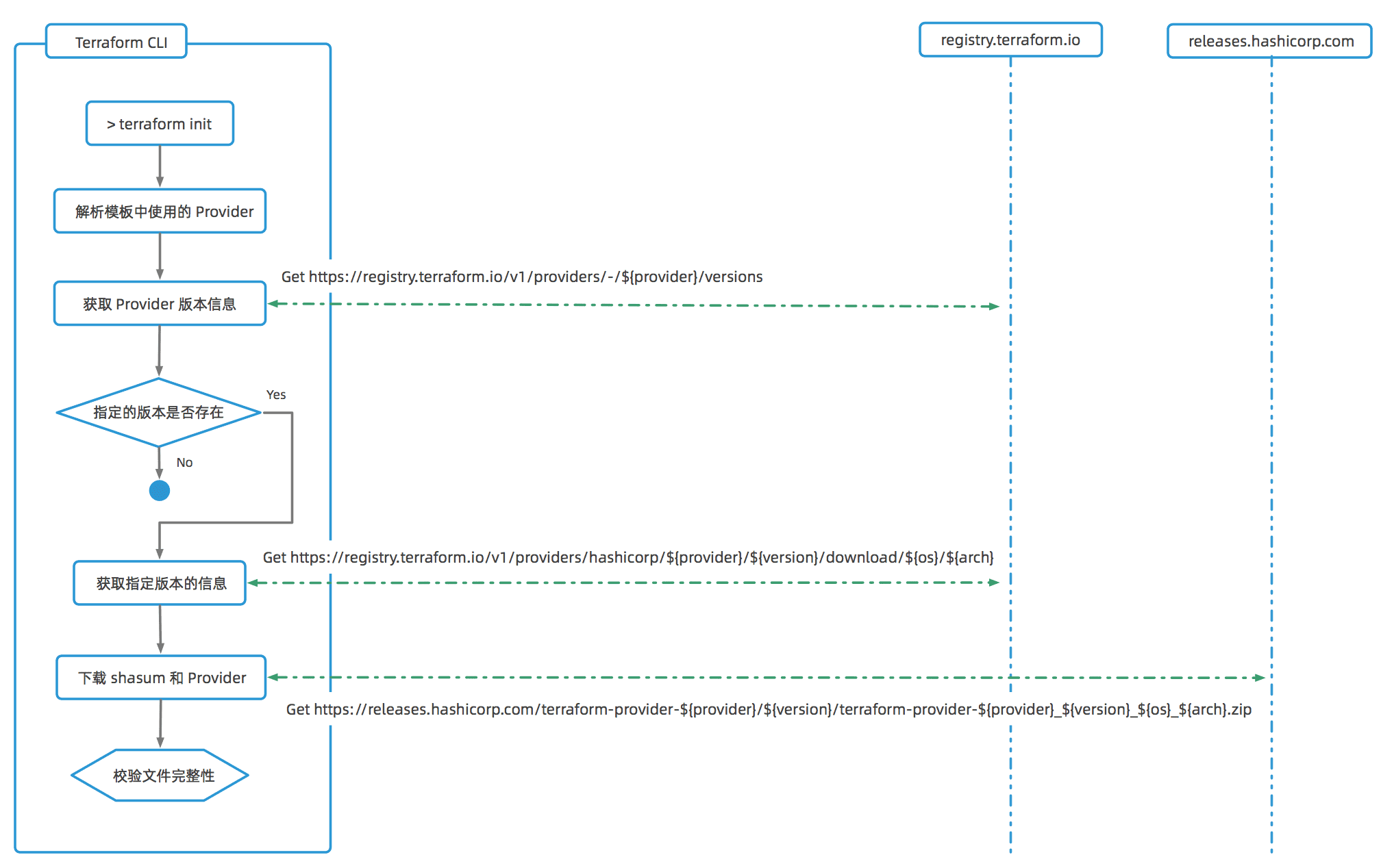 另一种比较 Hack 的方式,是设置 Provider Host。首先我们需要了解 terraform init 时,下载 Provider 的流程。