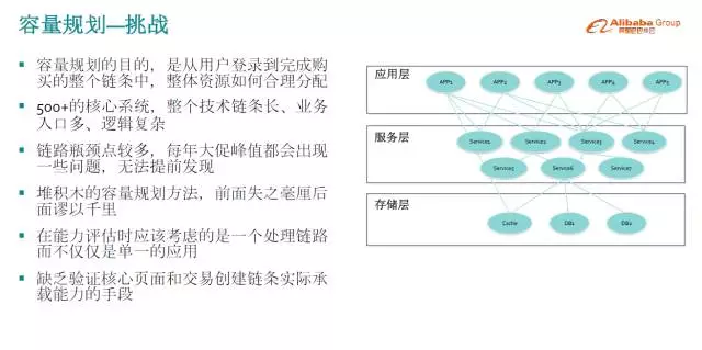 这个阶段很快就遇到了挑战,大家知道,早年在双11买东西时会遇到有一些大的、小的问题,跟容量规划不准有很大的关系。容量规划的目的是评估用户登陆、添加购物车、购买整个链条如何合理分配资源。刚才说一个应用双11加多少机器,根据对双11业务的理解来分配,这样做规划。这种流量规划是不是合理的?我们发现差距还是蛮大的,真正双11零点峰值的实际流量,与我们的规划差距比较大。