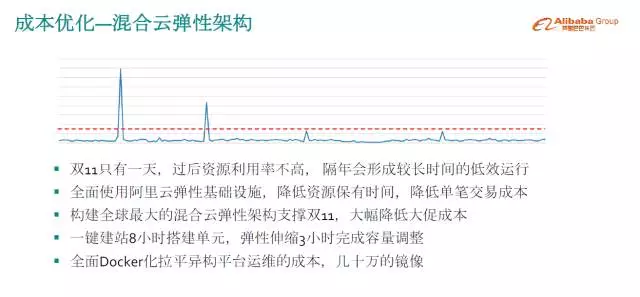 上面的红线是日常处理能力,这是截取的某一段时间,几个月内的峰值情况。大家会发现,日常情况下很多小活动,日常能力是能够处理的,大活动日常能力是不能处理的。为了一个活动增加了一批机器资源,活动过后很长时间机器是没法利用起来的,要长期分摊这个成本,对双11来讲就是这样。为了双11这一天增加了大量成本,过后一年都会有资源利用率不高的情况,很可怕的浪费,因为体量比较大,低效运行对成本影响很大。需要找到一个能够帮助解决短时间内要很多资源,长时间又都不需要的问题,阿里云的弹性能力就是最好的方案,所以我们选择阿里云的基础设施,做混合云弹性架构。它可以降低资源保有时间,大促就一天,剩下时间就把资源归还给云,这个方案大幅降低了大促成本。我们做的混合云架构支撑双11,规模是全球最大的。使用云的效率高不高,资源保有时间长短很大程度上取决于运维能力,包括怎么跟业务集成,也做了很多运维能力的升级。包括8小时在云机房拉起一个站点,就是前面讲的8小时建一个单元,成本节约。以前是20天,现在提升到1天,对成本优化的效果是非常明显的。