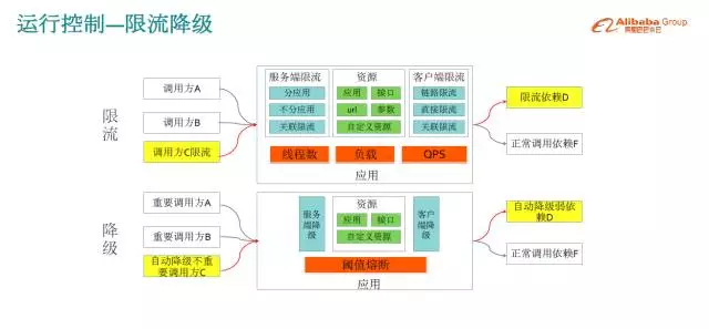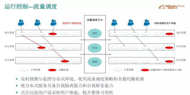 接下来看一下运行控制,系统容量已经调匀,有了最大吞吐能力,但是用户热情很夸张,超出想象。超出整个集群处理能力的流量,需要把它挡在外面,如果放进来的话,整个集群就一起宕掉了,一个请求都处理不了,整体瘫痪,这时必须做限流保护和有损服务,放进来的流量好好处理,没有放进来的,等一会儿刷一下也会进来,这是通用做法。