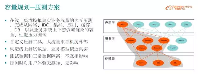 这个方案有什么意义,它打破了对于不可预知技术风险的控制能力,加速技术的进化。怎么理解?我们在短时间内可以大胆创新,大胆上新技术,更加激进。因为有一套保底方案,无论做多少创新,可以做到几个月升级一次架构,新技术几个月推到全网。因为双11要的是容量确定性,比如说要准备17.5万的能力,什么技术都可以尝试,最后通过线上演练,大流量全链路压测,看能不能达到17.5万。能达到技术是过关的,整体能力也是过关的,所以加速了技术的进化。
