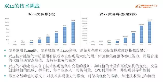 我们看一下整个双11的技术挑战是什么,大家知道做双11非常难,但是究竟难在什么地方?阿里内部有一句话:双11是业务的狂欢、技术的盛宴。阿里做了8年双11,这8年见证了电商业务的飞速发展,我们看一下业务指标变化。双11交易额从2009年的5.9亿到2016年,半个月以前的双11交易额达到1207亿,实现了200倍的增长。交易峰值从2009年的400笔每秒,到2016年17.5万笔每秒,增长了400多倍。系统规模也有几十倍、上百倍的增长。