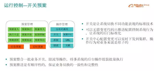 这是开关和预案,对双11来说非常重要。开关是系统后门,提供一套标准化的系统后门,可以让应用不改代码,通过配置改变行为,双11我们准备了非常多的开关。光有开关还不够,有些业务链条需要降级,可能一个链条上20个系统都要操作一些开关,才能把一个业务完整降级,在复杂系统上经常会遇到这样的场景。我们实现了一套预案体系,保证一系列的开关能有序、完整的被执行,而且每一台服务器都要执行到位,保证一致性、完整性。