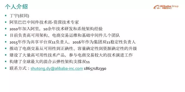 丁宇:大家好!我今天演讲的主题是《零点之战–阿里双11高可用架构演进之路》。大家知道,规模和场景是驱动技术发展的关键要素。阿里做了8年双11,业务规模有上百倍的增长,系统的复杂度和大促支撑难度更是以指数级攀升。随着规模的增加,技术挑战也非常不一样,后面会展开讲。这是一个世界级的场景,双11最难的就是保障零点峰值的稳定性,我们把它当做一场战争来打,是一场不能输的战争。面对世界级的难题,在业界没有什么可以参考和借鉴的对象,所以我们都是自主创新,沉淀了很多技术产品,高可用性的产品,经历了几代的架构演进,今天我会选取一部分跟大家做个交流。下面是我的个人介绍,和联系方式。