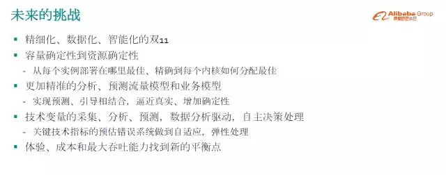 做了这么多年双11,未来会有哪些挑战?我们希望能做到精细化、数据化、智能化的双11,从容量确定性到资源确定性,哪些应用放在一起,什么样的配置放在一起会让整体集群达到最佳状态,后续希望做到每一台物理机的内核怎么分配,仍然知道如何匹配达到最佳状态,进入到微观的层面,目的还是一样,让整体集群全局没有瓶颈,做到非常精细化。技术有很多变量,叠加会产生风险,所以要精细分析、预测,得出逼近真实的流量数据模型。我们希望做到智能化的双11,还是对这些变量,要通过数据分析去自我决策。根据多年的积累,系统对一些变量的变化区间是有容忍度的。一种是可以自我决策,降级是一种决策,一种是可以容忍变化。做到这样系统已经非常智能了,双11的时候不用做太多工作,大家可以看到曲线飙升,系统平稳运行,这是非常理想的。