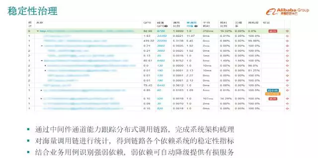 下面说一下稳定性治理。当系统复杂到一定程度,没有一个人能掌握整个系统架构,只能用中间件能力来识别架构复杂度,理清关系。通过中间件的通道能力跟踪整个调用链条,推动架构梳理,整理出依赖关系,对海量调用进行统计,得到各个系统的稳定性指标,这都是从数据中挖掘的。比如说调用层次、响应时间,哪里阻断了会影响业务,哪里阻断了不会影响业务,都是被挖掘出来的。同时会结合业务测试用例看哪些链条可以被降级,哪些不可以降级,有些降下来主业务就不显示了。技术同学会对弱依赖做业务容错,强依赖要保证系统不能挂,稳定性治理非常关键。