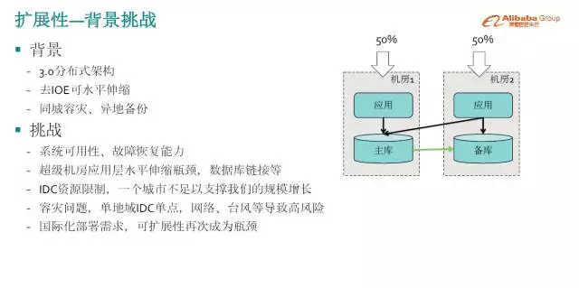 这套架构逐渐在双11碰到了很多问题,当规模增长的时候,对机房体量要求越来越大,要有很大的规模。分布式架构下,比如说A集群要对B集群有服务依赖调用,规模都是5千台,大家知道负载均衡的机制,需要建立连接。五千对五千,连接数在超级机房下是一个很大的挑战。数据库也一样,你规模达到了一万台,每台都要建立连接。单机房无法承载业务系统规模的增量,扩展性是在中间件这一层受到限制。