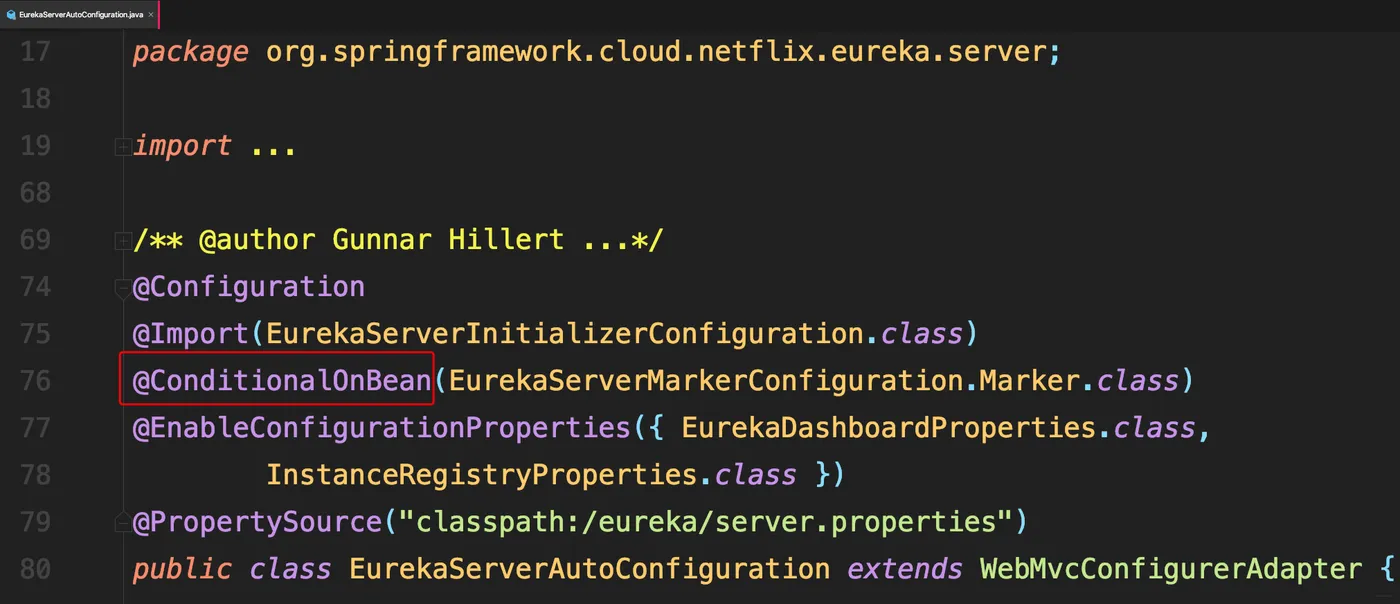 所以@EnableEurekaServer就是个开关,只要写了该注解,spring 就会帮你把EurekaServerAutoConfiguration类注入进来。