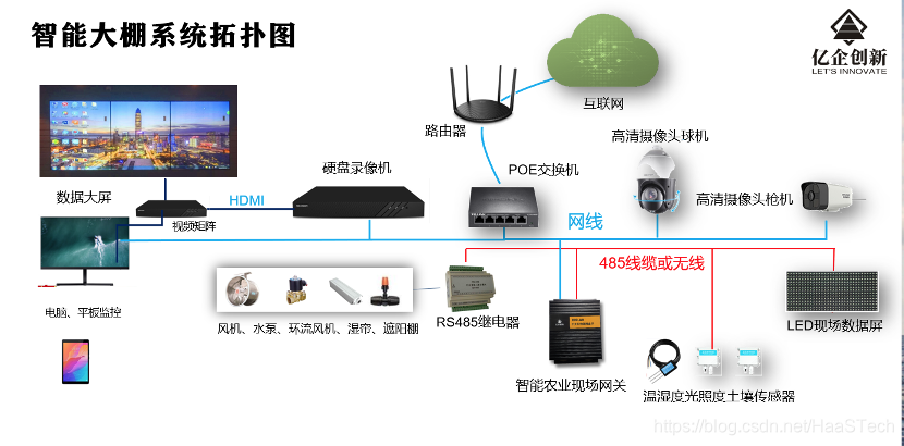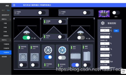 整套系统是由59个农业传感器,通过Modbus连接到3台物联网主机IDC-A9(Haas100内核),采集10亩面积里的温湿度,光照度,二氧化碳浓度,土壤温湿度,室外气象站数据,云端根据智能控制策略,通过120个控制开关,控制风机,水泵,湿帘等执行单元,实现大棚环境的智能干预,为作物提供最佳的生长环境。