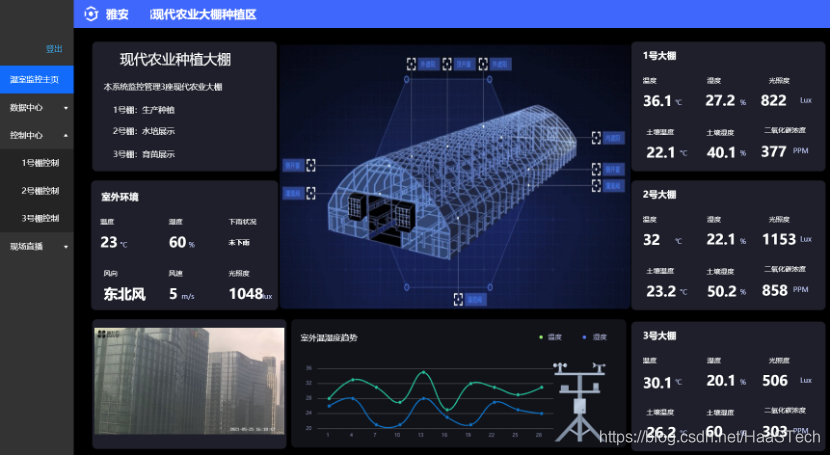 在成都雅安有一个在建的320亩的农业示范基地,集现代农业温室大棚,文旅,生态农业为一体,其中我们公司做了其中温室大棚(10亩)的物联网智能化环境检测控制系统,完成大棚内6种环境参数、室外气象站数据的采集,以及风机水泵之类的全智能化自动控制,还有实时数据采集,数据大屏系统。