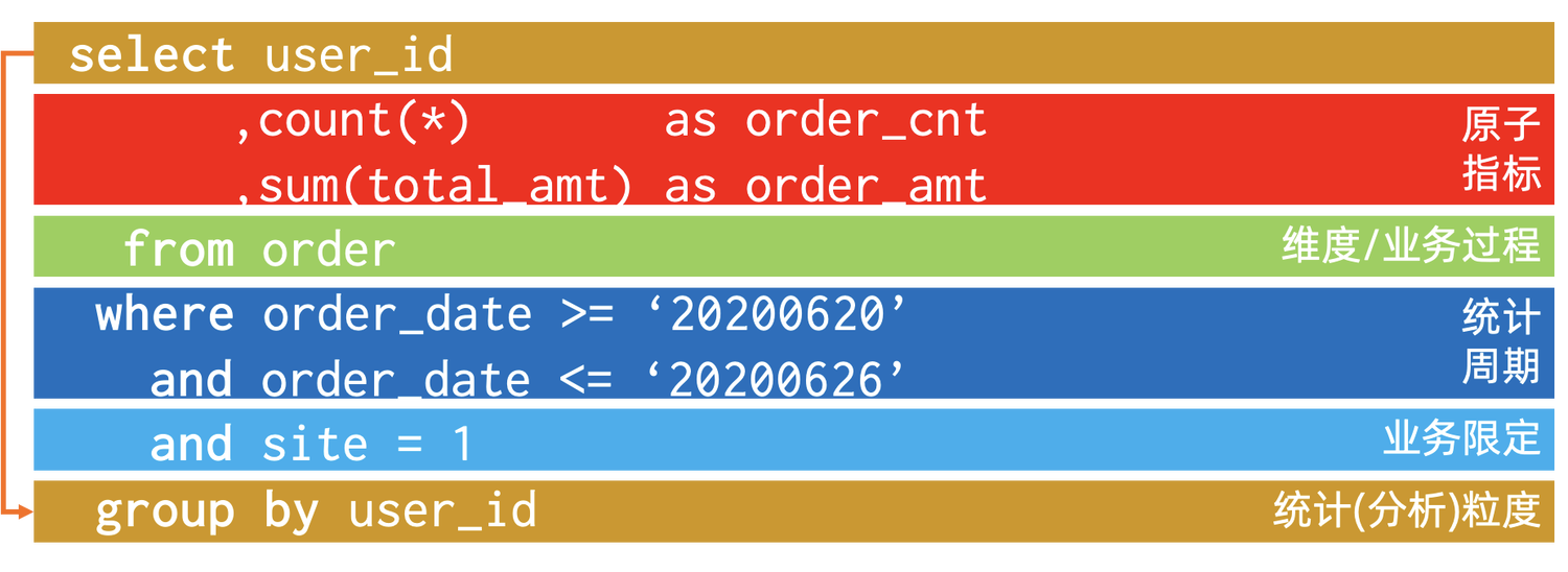 - 原子指标, 分析指标不区分维度不加任何约束限制的基础抽象, 即例子中的 "下单金额", 原子指标是对实体的某个属性在所有实体实例上的整体刻画, 是一种统计性描述, 即原子指标一定是一个聚合表达式,如求和, 平均, 最大, 最小等