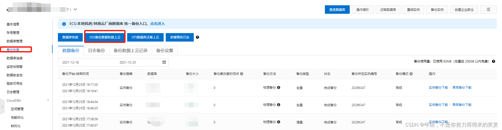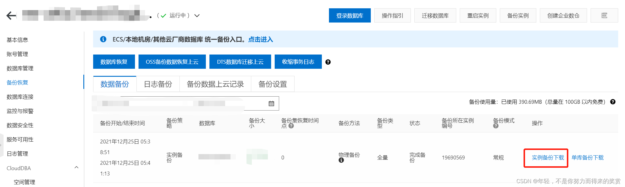 从云数据库,备份恢复中,下载数据库备份文件。
